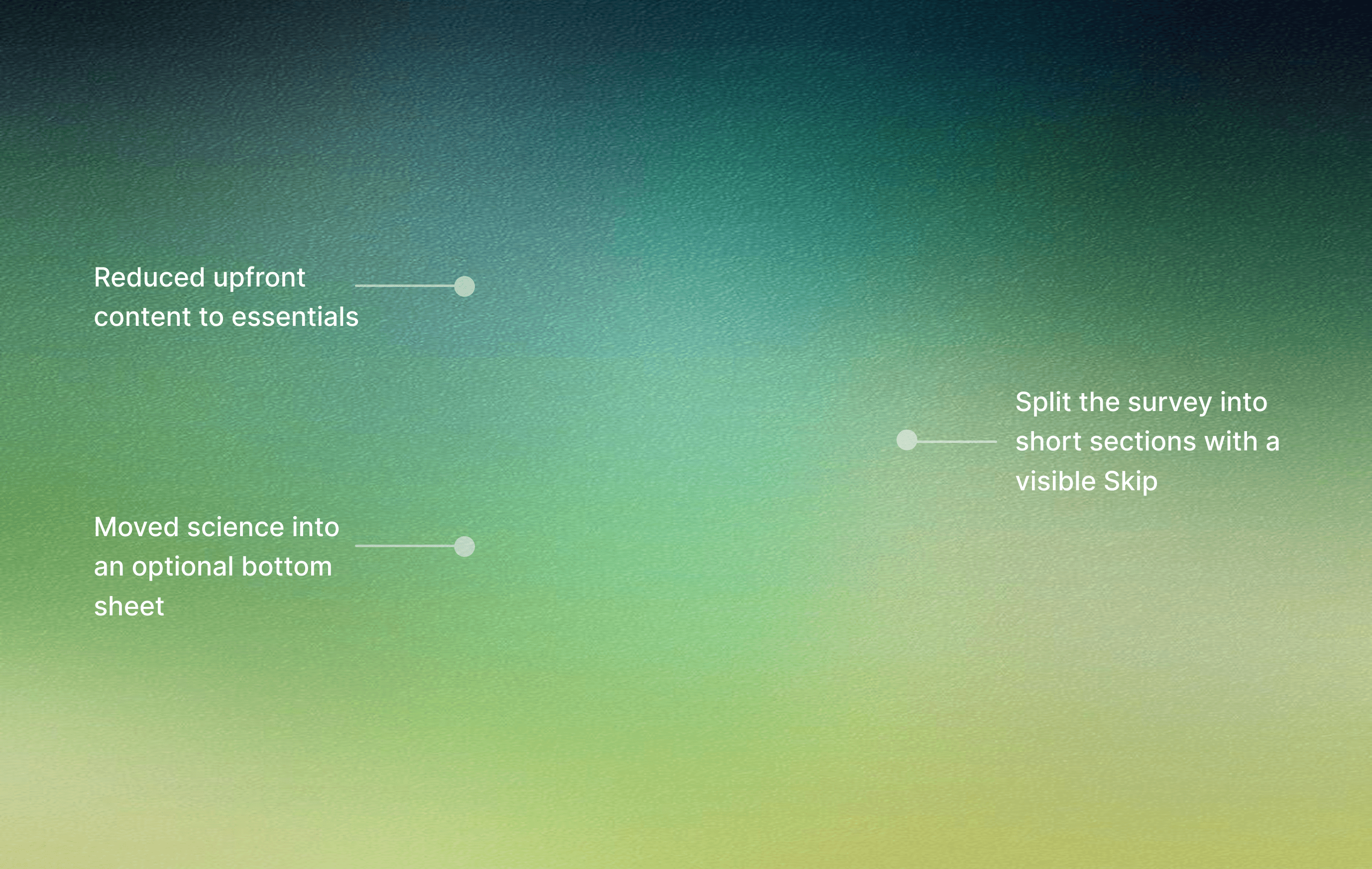 We simplified the survey entry, surfaced only what users needed to start, and made progress and skip options visible from the beginning.