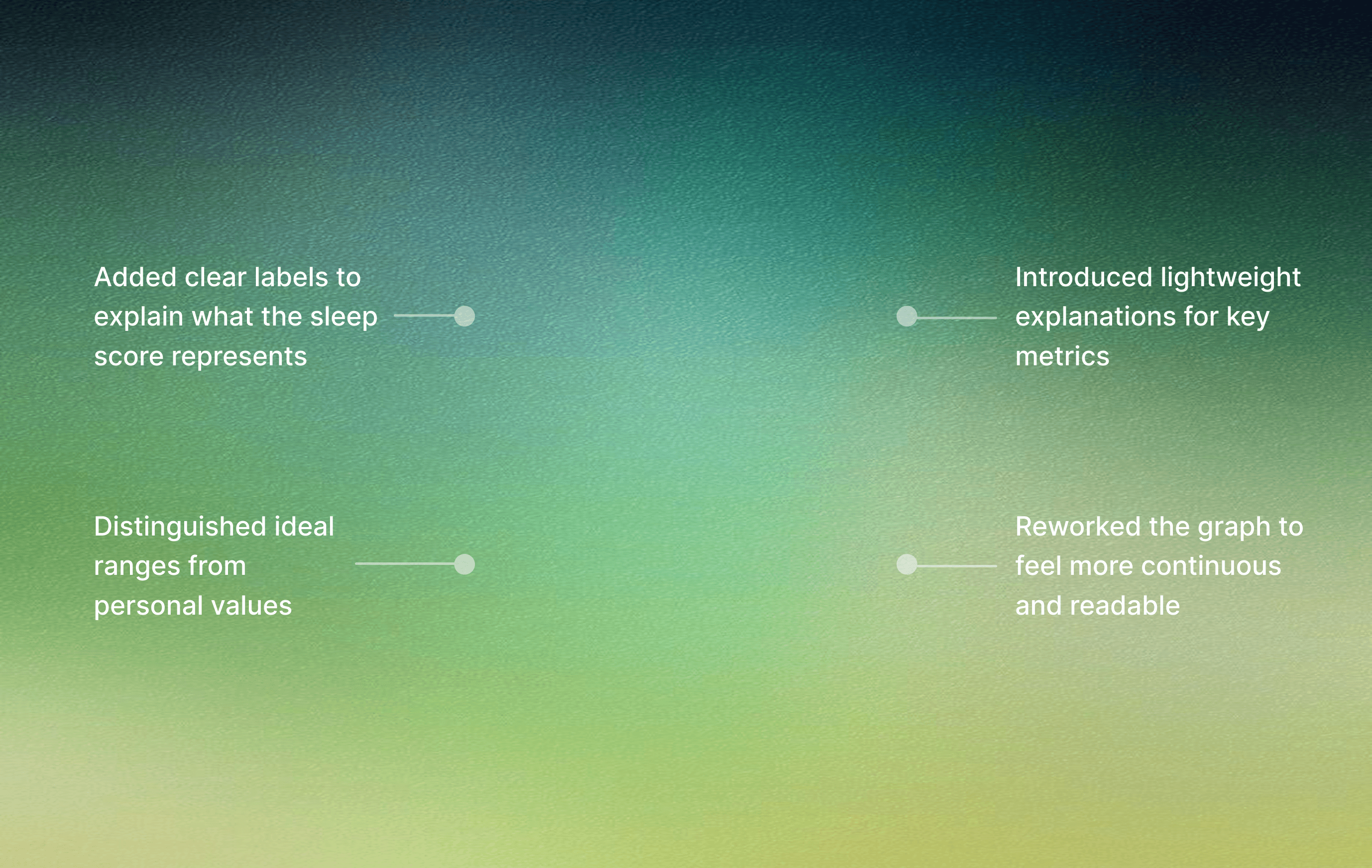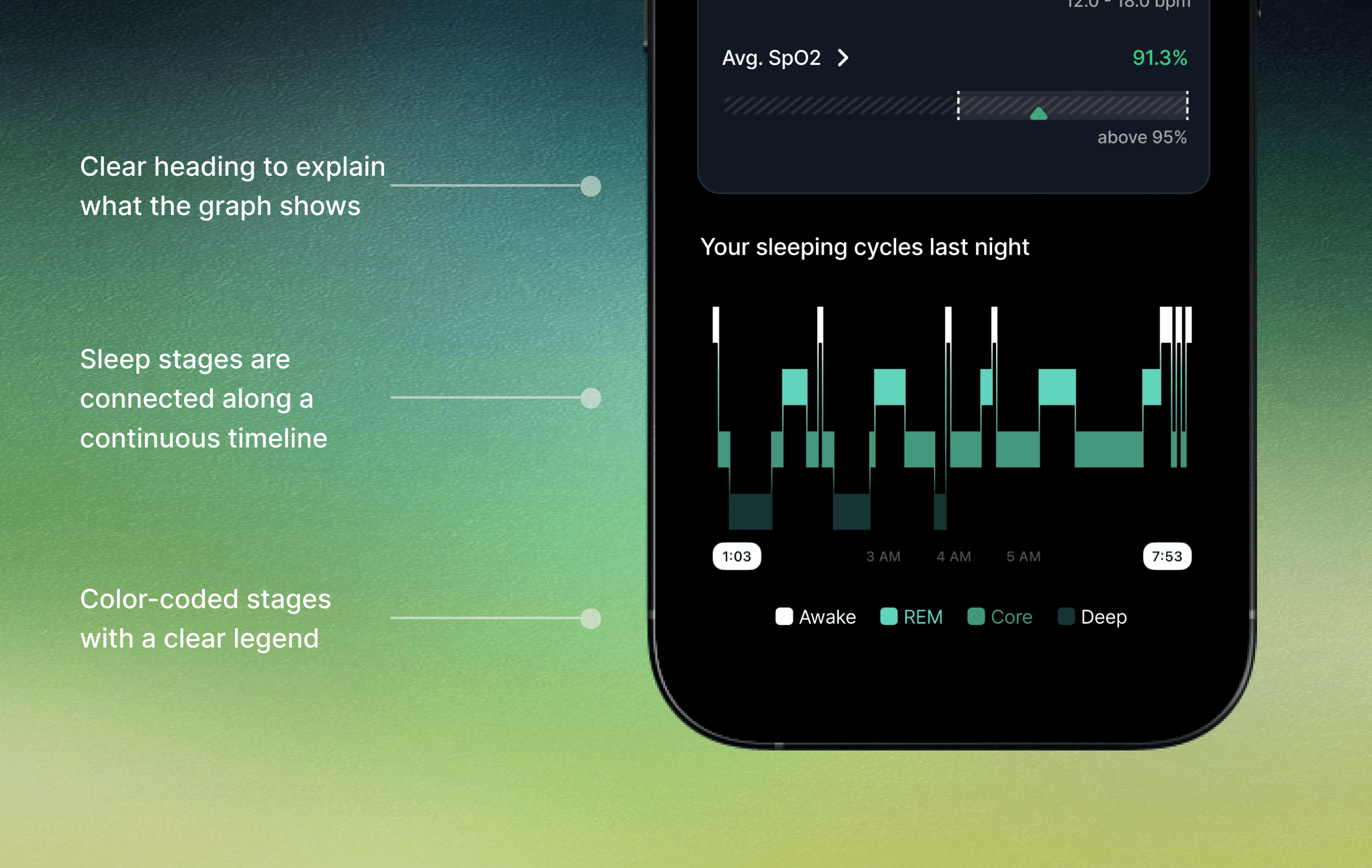 We redesigned the sleep graph to feel more connected and chronological, helping users understand their night as a single flow rather than isolated segments.